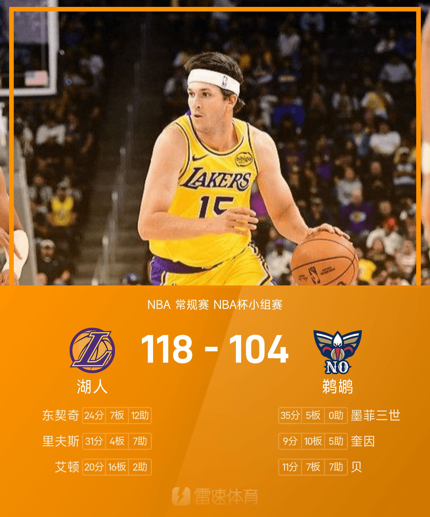 รายงาน NBA Cup: รีฟส์ 31 แต้ม 7 แอสซิสต์ เลเกอร์ส เอาชนะ เพลิแกนส์ 118-104