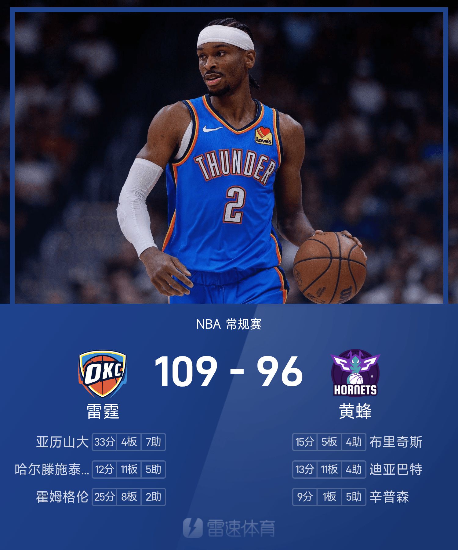 รายงานของ NBA: อเล็กซานเดอร์มี 33 แต้ม 7 แอสซิสต์ ธันเดอร์เอาชนะฮอร์เน็ตส์ 109-96