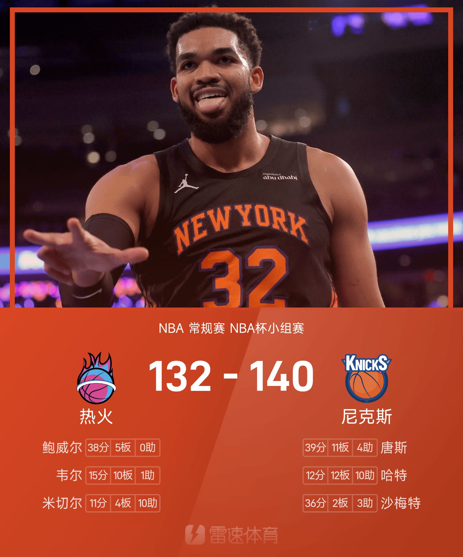 Knicks star Towns ทำคะแนนได้ 31 แต้มในช่วงพักครึ่ง และทำ 39 แต้มในเกมด้วย 11 รีบาวด์ 4 แอสซิสต์ และ 1 สกัดกั้น นำทีมไปสู่ ชัยชนะ