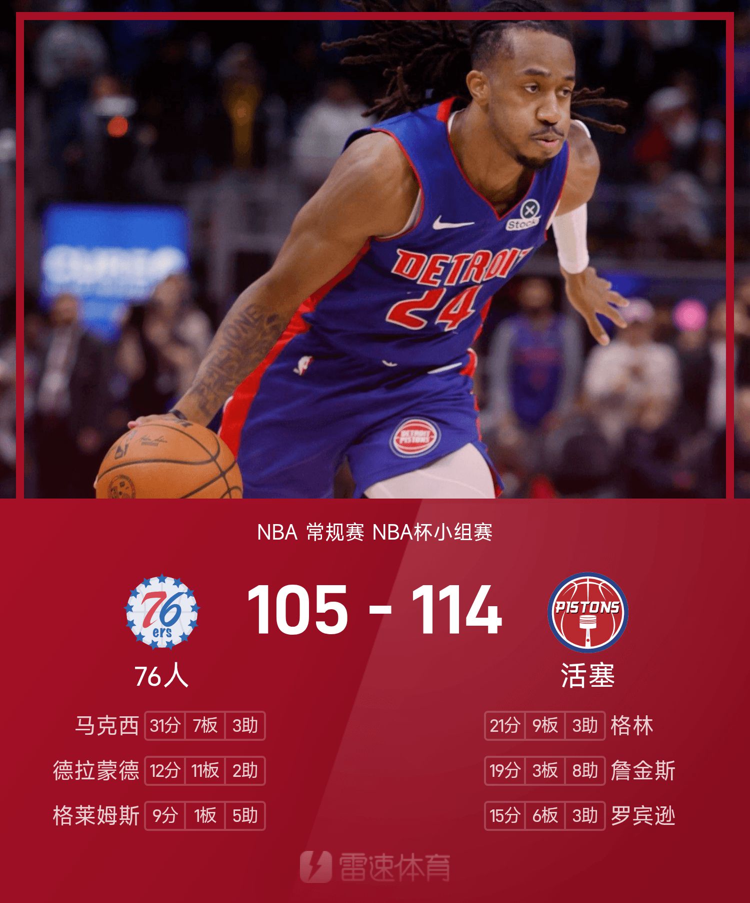 ด้วยสามพอยน์เตอร์ 5 จาก 8 ครั้ง เจนกินส์นำลูกสูบโดยไม่มีคันนิงแฮมเพื่อเอาชนะ 76ers ด้วย 19 แต้ม 3 รีบาวน์ และ 8 แอสซิสต์ แม็กซี่ทำไป 31 แต้ม 7 รีบาวด์ 3 แอสซิสต์