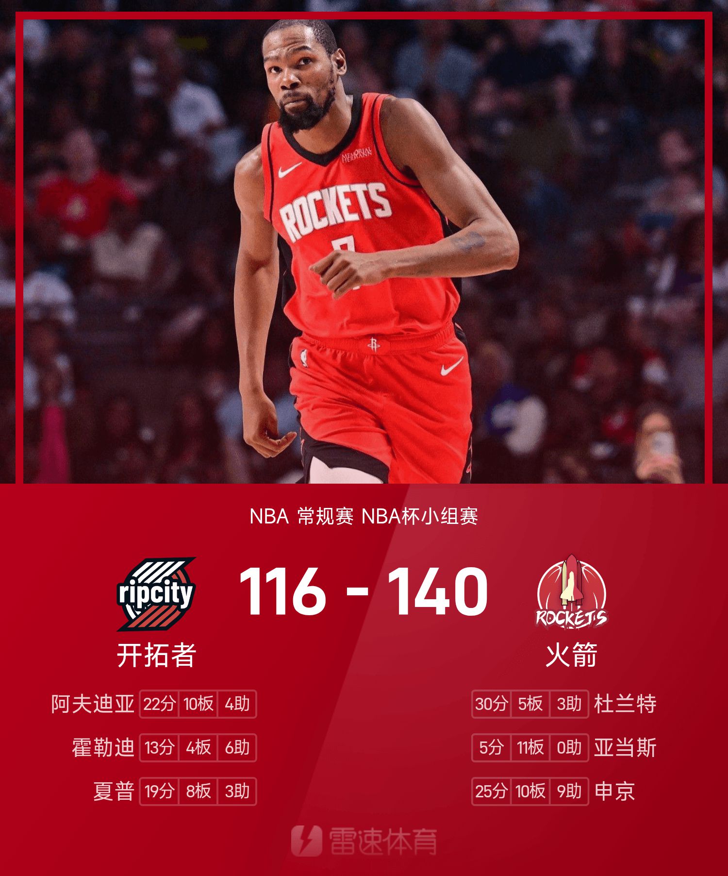 ด้วยค่าบวกลบที่ +37 ดูแรนท์ทำคะแนนได้อย่างมีประสิทธิภาพ 30 แต้ม 5 รีบาวน์ และ 3 แอสซิสต์ ทำให้ทีม Rockets คว้าชัยชนะเหนือเทรลได้อย่างสบายๆ เบลเซอร์