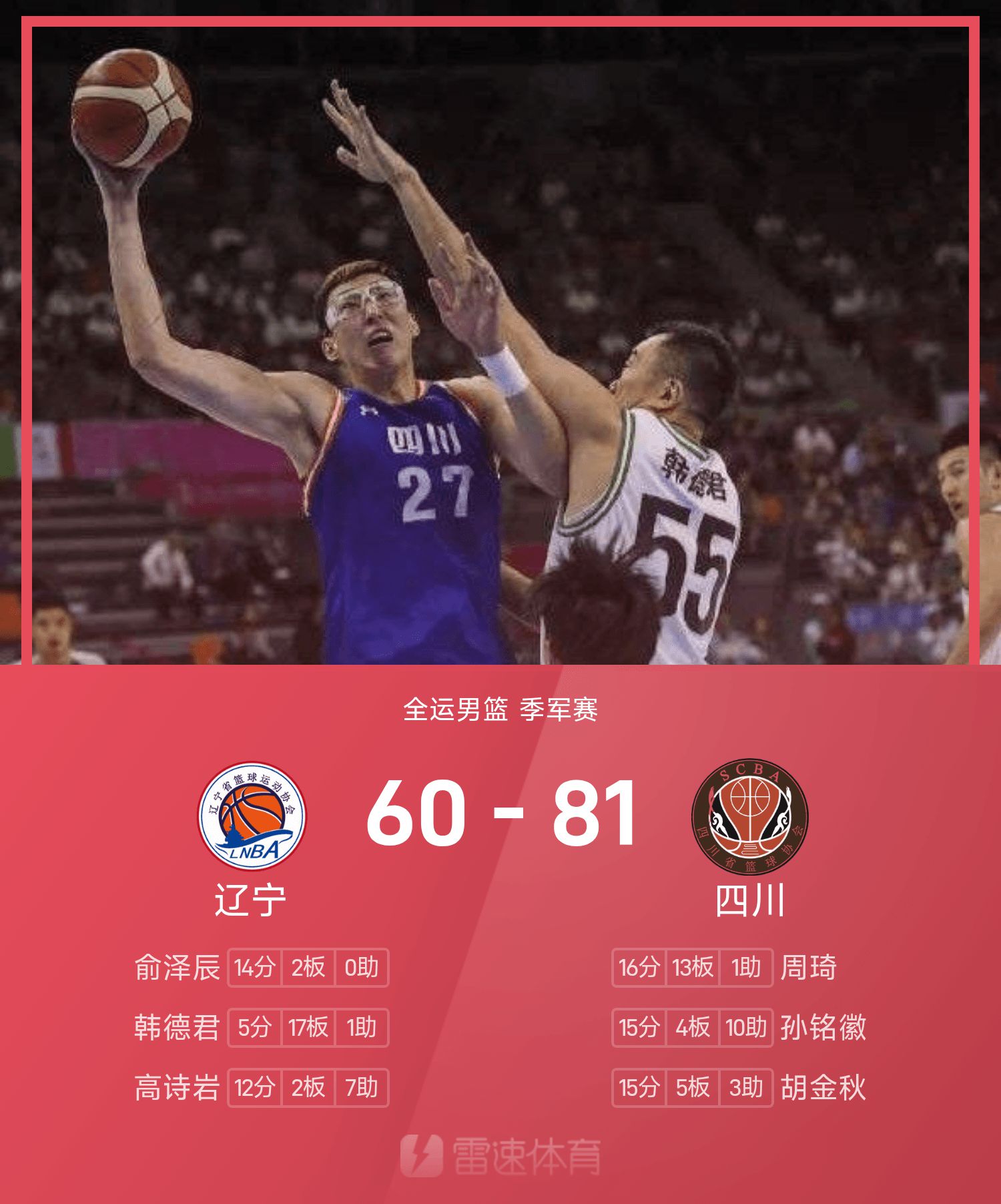หลังจากที่ทั้งสองฝ่ายต่อสู้กัน เสฉวนเอาชนะเหลียวหนิง 81-60 และคว้าเหรียญทองแดงบาสเกตบอลชายการแข่งขันกีฬาแห่งชาติ