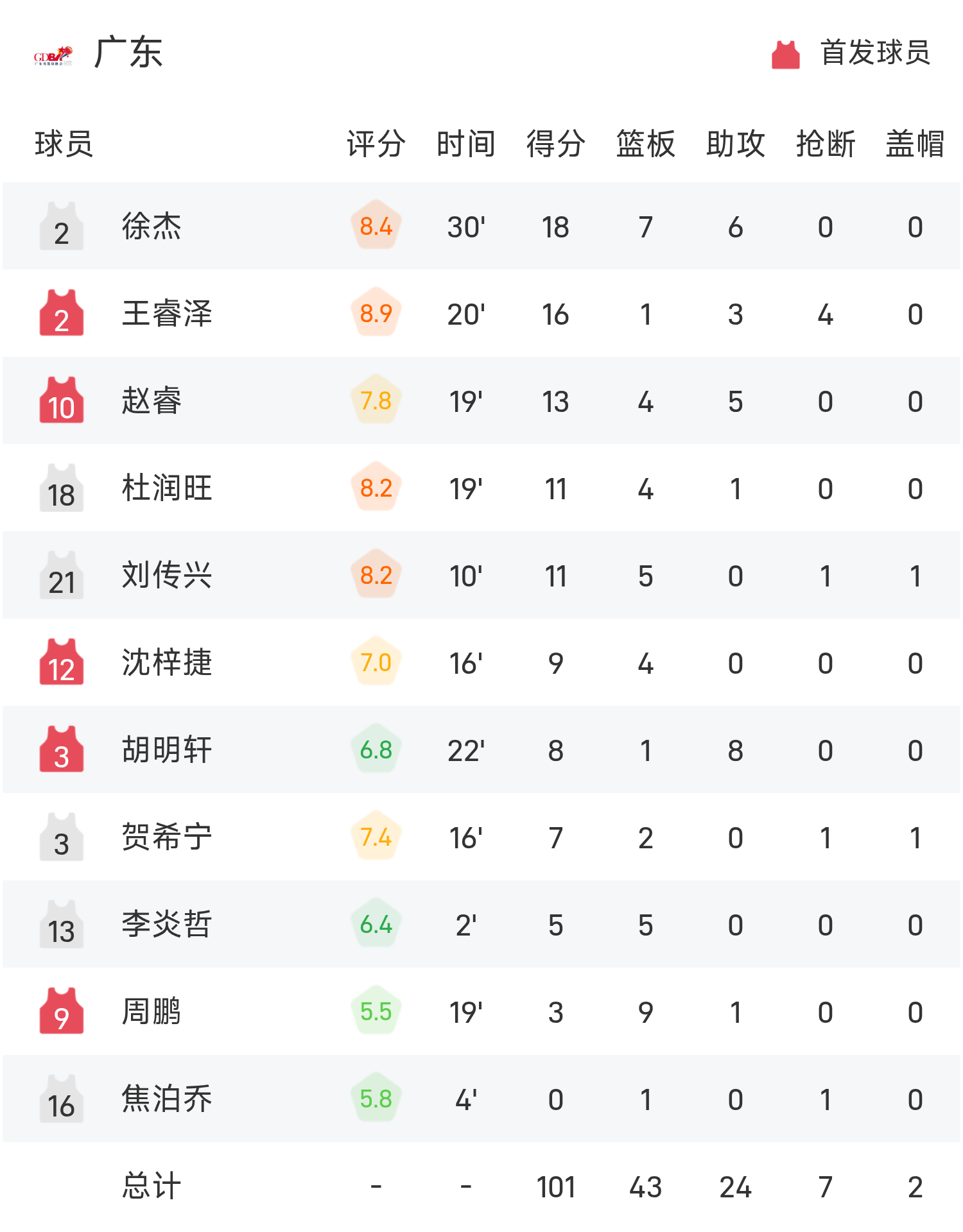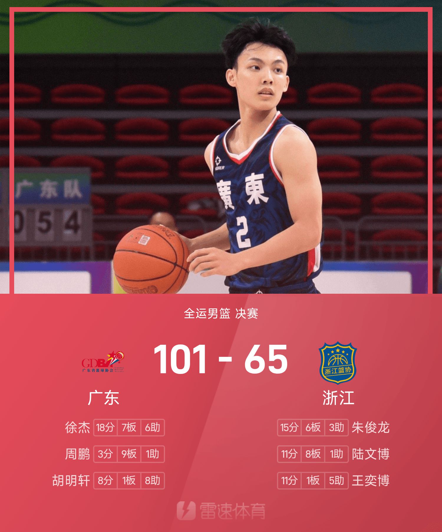 Xu Jie ทำคะแนนสูงสุดในเกมได้ 18 แต้ม 7 รีบาวน์และ 6 แอสซิสต์ ในขณะที่ Zhao Rui ทำคะแนนได้ 13 แต้ม 4 รีบาวน์และ 5 แอสซิสต์ นำกวางตุ้งไปสู่ชัยชนะและคว้าเหรียญทองบาสเกตบอลชายในการแข่งขันกีฬาแห่งชาติครั้งนี้