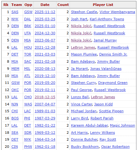 มันยากแค่ไหนสำหรับผู้เล่นในทีมเดียวกันที่จะมีทริปเปิล-ดับเบิ้ลในเกมเดียวกัน? ในประวัติศาสตร์ NBA มีเพียง 20 ครั้ง โดย Westbrook เข้าร่วม 4 ครั้ง