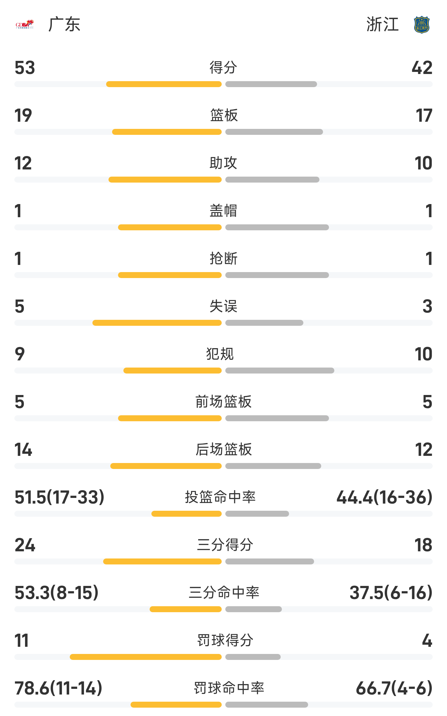 ผู้เล่นสำรองของกวางตุ้ง ซูเจี๋ยทำคะแนน 15 แต้ม 1 รีบาวด์และ 2 แอสซิสต์ ส่วนกองหน้าเจ้อเจียง จูจุนหลงทำคะแนนสูงสุดในทีมได้ 13 แต้ม 5 รีบาวด์และ 3 แอสซิสต์