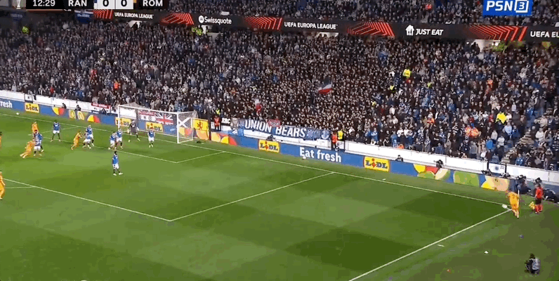 22’ ซูเลยิงจากด้านนอก และผู้รักษาประตูของเรนเจอร์สก็เซฟบอลจากเส้นหลัง