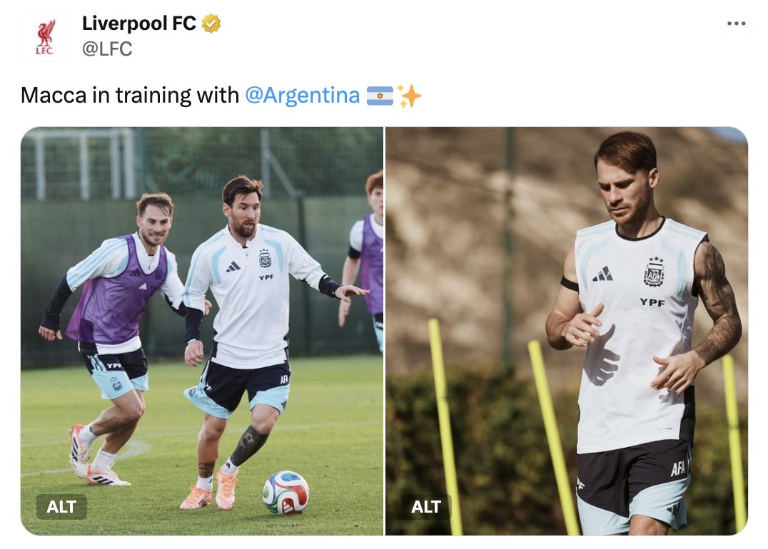 ทวีตอย่างเป็นทางการของลิเวอร์พูลโพสต์ภาพการฝึกซ้อมทีมชาติของ Macca และเมสซีถูกแฟน ๆ เยาะเย้ยเพราะอยู่ในภาพ