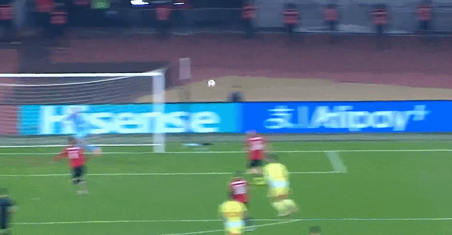 18' บาเอนาผละตัวออกจากการ์ดที่ด้านบนของส่วนโค้งแล้วตีเข้าประตูด้วยเท้าขวา จากนั้นลูกบอลก็ชนเสาและ โผล่ออกมา