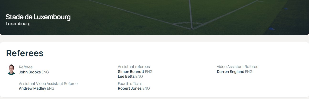 ตามข้อมูลของเจ้าหน้าที่ของยูฟ่า เกมนี้จะดำเนินการโดยทีมผู้ตัดสินจากพรีเมียร์ลีก หัวหน้าผู้ตัดสินคือ จอห์น บรูคส์ และผู้ตัดสินวิดีโอคือ ดาร์เรน อิงแลนด์